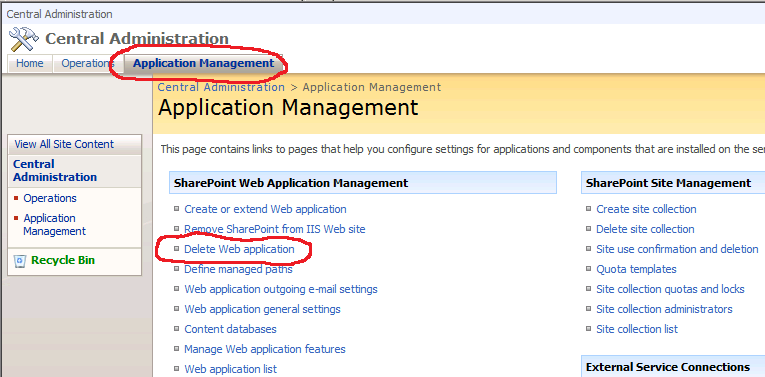 - Select the “Application management” tab, in the menu select “Delete Web Application”