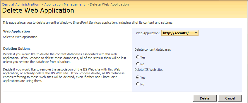 - Select the default web application (in this case HTTP://sccm01)