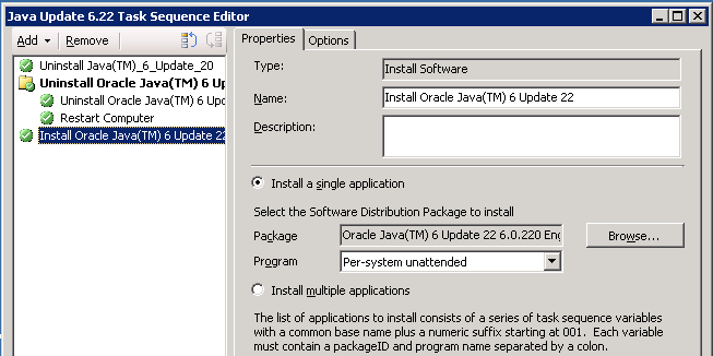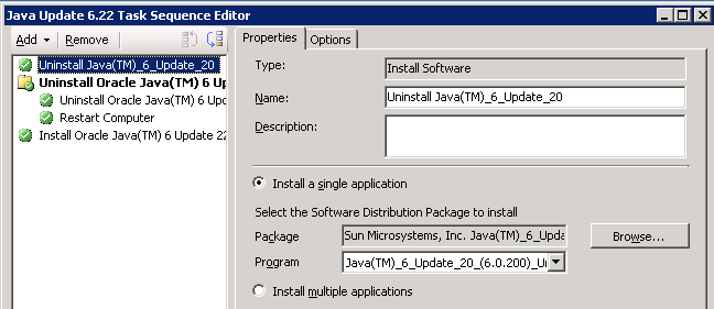 I wonder: do you distribute the task-sequence in logged-off mode only or also when a user is logged in? It’s not really an issue with something like Java (except you have many business critical applications running on Java) but how do you handle the uninstall/reboot/install scenario for applications that are probably already running and in use 24/7 (like Office, Lotus Notes, SAP etc.)?