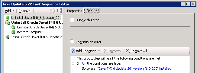 - On the Java 6 Update 20 step, select the options tab and add the following conditions: