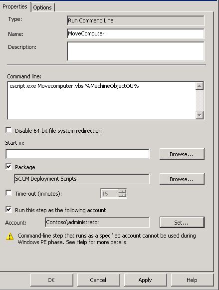 Using this excellent script in a MDT/SCCM Task Sequence is very simple and straight forward, the command-line below will move the computer to the MachineObjectOU configured in MDT settings file or database.