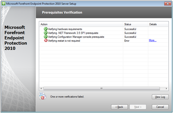 However almost every installation of either the server or the console extensions, the “Prerequisites Verification” step fails on the “Verifying a restart is not required” action.