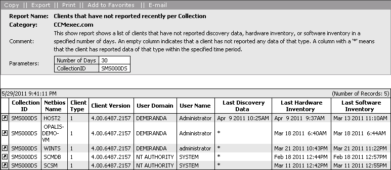This can be useful for providing reports for different sites, division or regions with client activity, so that they can check non-responsive clients in their area. The report can be downloaded here: https://ccmexec.com/wp-content/uploads/2011/05/Last_Inventory1.mof