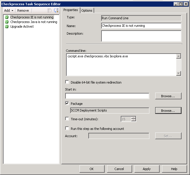 I have a task sequence setup for uninstalling old versions of Java, and then installing the latest. It works great when IE is closed on the client machines. The information in this article is exactly what I want to do. I want the task sequence to fail if iexplore.exe is running. I tried the above script on a machine. When I open IE on the client receiving the task, it fails and gives me the error code, which is what I expect. However, when I run the task sequence on the same machine with IE closed, I get the same error message. I want the task sequence to continue if IE is closed. Any ideas as to what I might be doing wrong?