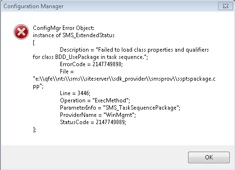 When the Admin console connected using the newly installed SMS Provider we got this error as soon as you try to edit a Task Sequence which uses the MDT integration: