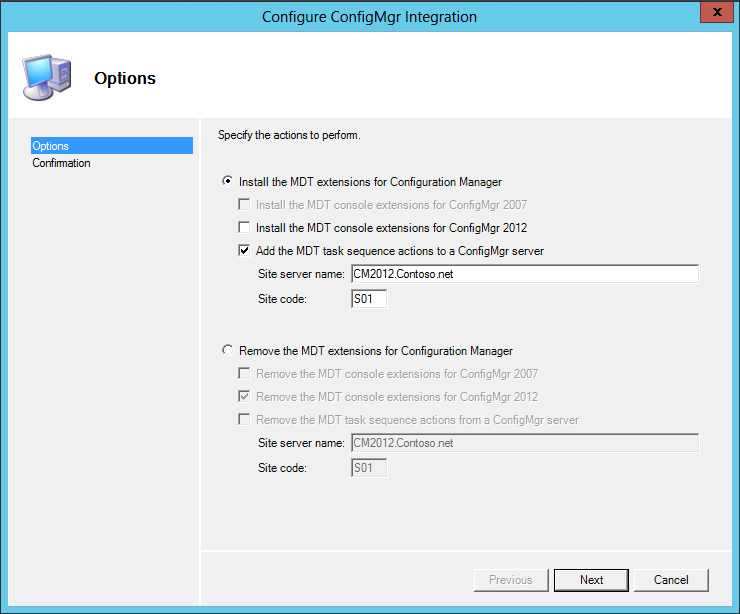 3. On a server with the SCCM console and MDT installed, run the Configuration program again, select “Install the MDT extensions for Configuration Manager” and “Add the MDT task sequence…” – and then select the remote SMS provider as the “Site server name”.