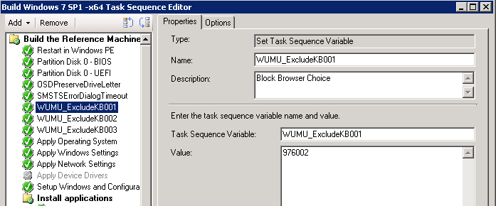 Each exclusion needs a new variable and the value can be either the ArticleID or the KB number. Below is an example on how to block the browser choice, which is a big pain in the European Union, note that the KB should be written with the KB number only.