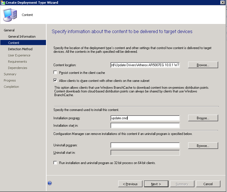 - Select the folder created earlier as the package source and enter Update.cmd as the installation command.