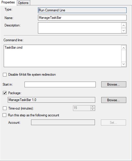 - In your Task Sequence add the taskbar.cmd command using the Run Command Line task.