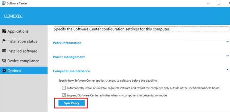 Yesterday Configuration Manager Technical Preview – 1602 was released, the installation worked great!! One of the most useful features so far is that we now have a “Sync Policy” button in the new Software Center UI. I am extra excited about this as I filed a Uservoice item for a while back and finally seeing it in the product is really cool and proves that the Uservoice is important and that Microsoft delivers from the suggestions you place there and vote for.