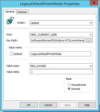 HKEY_Current_User\SOFTWARE\Microsoft\Windows NT\CurrentVersion\Windows\LegacyDefaultPrinterMode Dword: 0x00000001