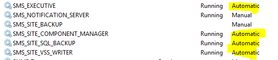 11. Start Configuration Manager Services and change startup to Automatic for the services that we changed above.
