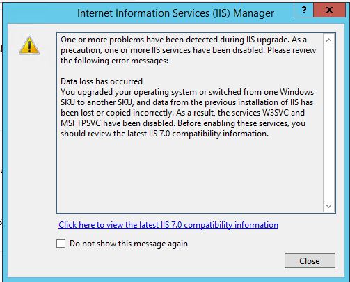 8. Verify that the upgrade was successful, review event logs and start IIS Manager and review the IIS settings, my IIS was disabled, see note below.