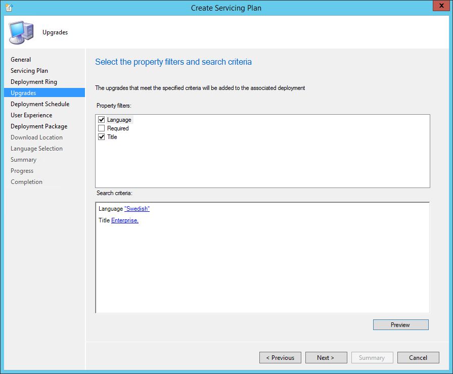 The new step in 1602 is Upgrades it didn’t exist in 1511. In my case i select “Swedish” and “Enterprise,” using the “,” to filter out the Enterprise N version which I don’t want to download or deploy.