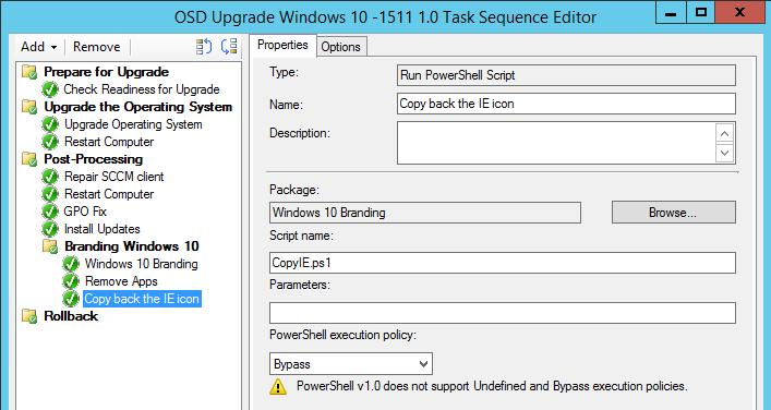 So we need to solve this, when doing modifications to Windows 10 like uninstalling apps and so on we must use a Task Sequence to upgrade from one Windows 10 version to the next otherwise all default apps will be installed and again for instance. So what we do is simply a step that copies the IE icon back after the upgrade is complete and the icon has been removed. The IE Shortcut must be there when the user logs on otherwise it will be removed from the start menu.