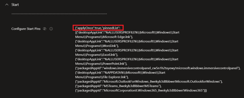 In Windows 11 the Start Menu is modified using the “Configure Start Pins” setting in the settings catalog, what makes it possible to deploy an initial Start Menu is the addition of the variable “ApplyOnlyOnce”:true in the .json file used to configure the Start Menu.